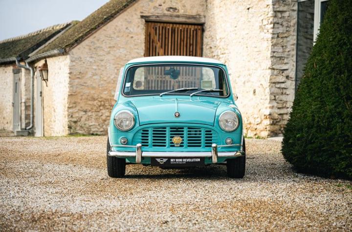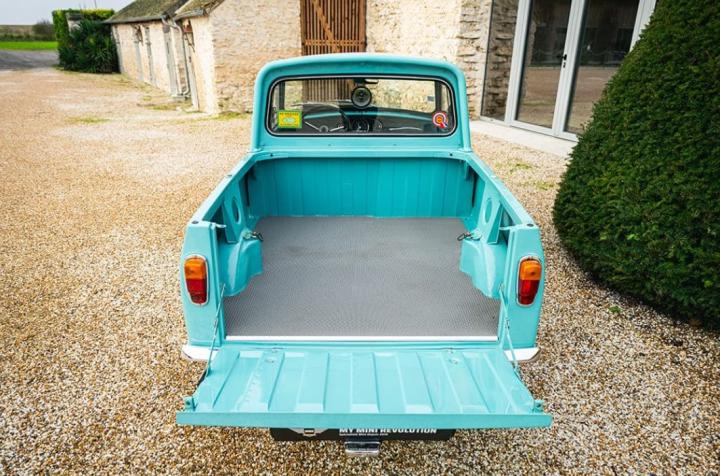 Ce charmant Morris Mini Pick-Up de 1975, dans sa teinte Aquamarine, est dans une configuration absolument authentique.