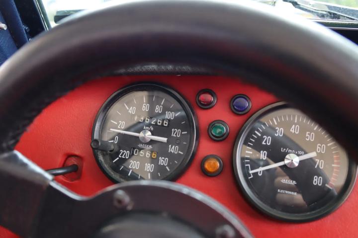 The car is finished in dark blue with a red interior, which contrasts beautifully. The paintwork is still neat and there are no signs of rust or damage. The chrome work, lighting and windows are also in good condition: the prominent exhaust pipe, engraved with the model name, shines exceptionally well. The 5-spoke 14" alloy wheels are also in very good condition. Characteristic features are the robust roll bar and the spare wheel at the rear.