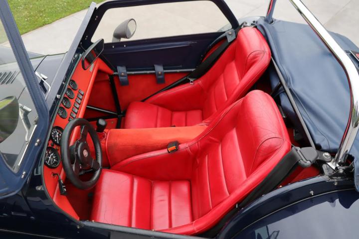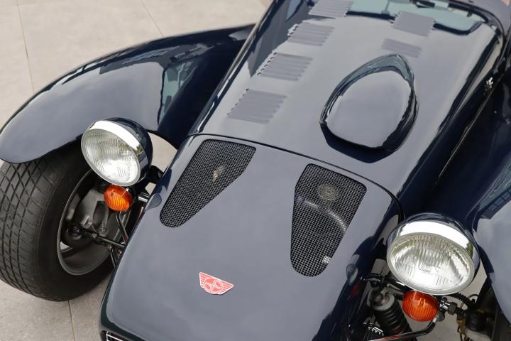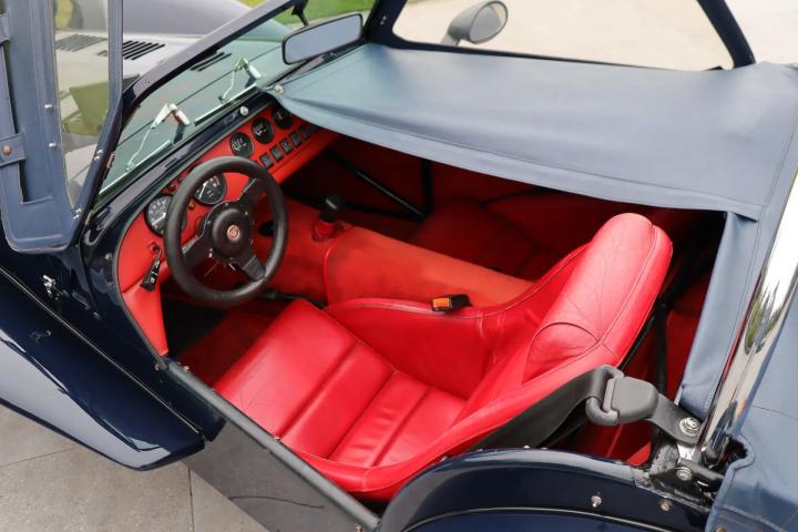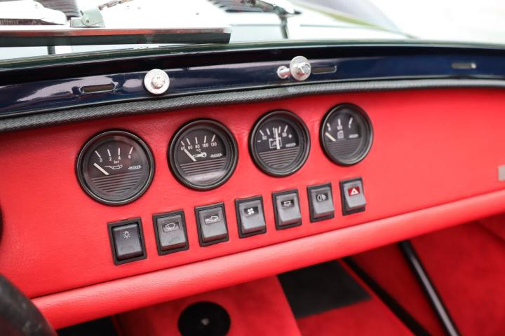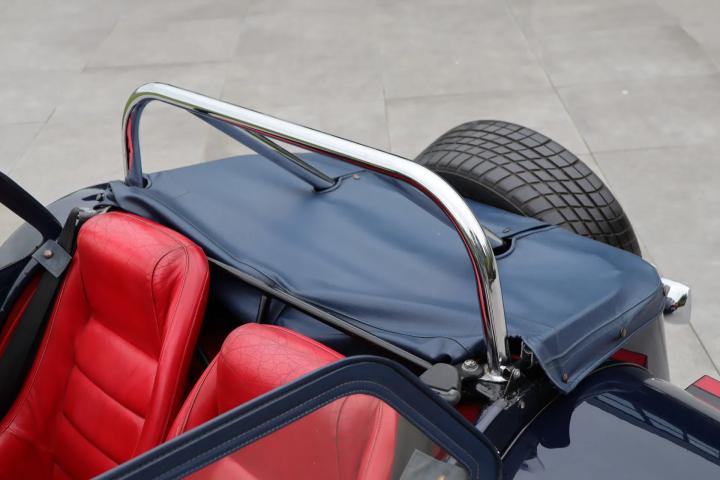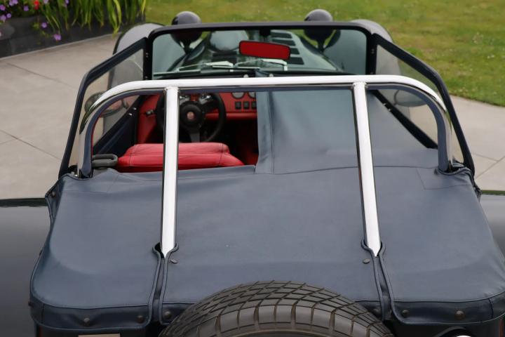 The interior is also in good condition with no damage, but only slight signs of wear on the leather-upholstered seats. The leather-covered dashboard has space for four centrally located gauges, seven centrally located buttons and two large gauges located directly in front of the driver. Clear and uncluttered, in keeping with Donkervoort's motto: “No Compromise”. The soft top, tonneau cover, doors, carpet set and the rest of the interior are all in good condition and undamaged. A radio/CD player with speakers is mounted behind the front seats.