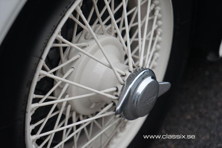 Exterior: The Jaguar XK120 M we have for sale today is a striking car in white. It looks a bit sportier than the standard XK, with its lower ride height and wire wheels. The paintwork on this car is absolutely stunning, as are all the chrome details. All panel gaps are perfect, and the doors open and close effortlessly, even with new rubber trim. The teardrop design and split front screen of the Jaguar XK120 Coupe reminds you of the style of exclusive French cars from the 1940s. The spoke wheels are in good condition and fitted with Michelin Pilote X tires, which are the best available tires for these cars.