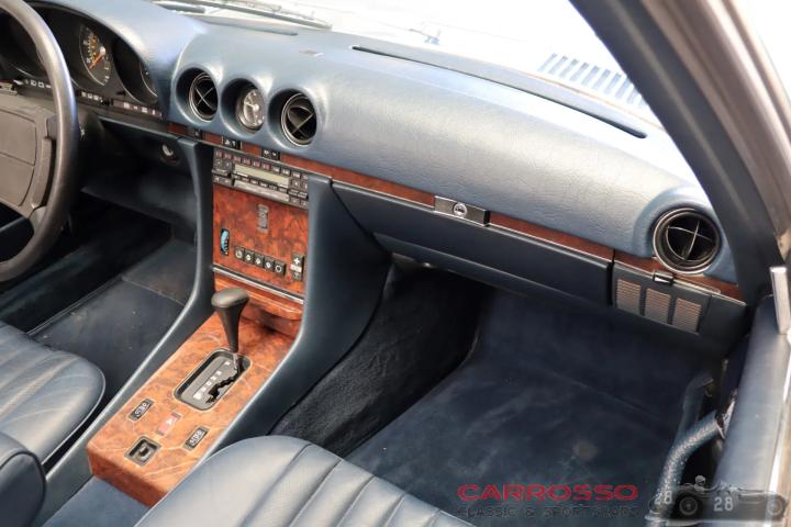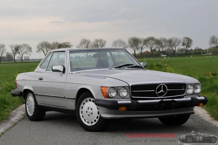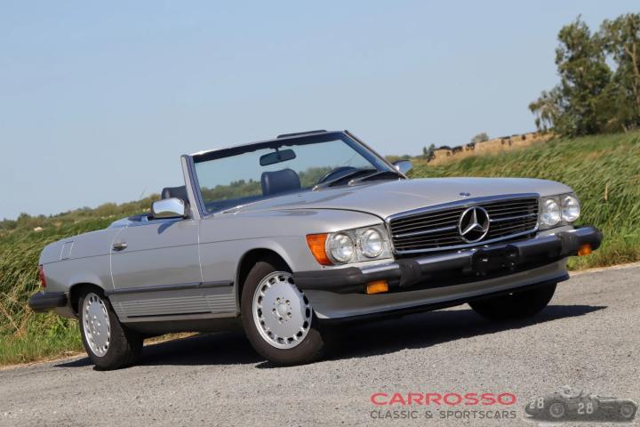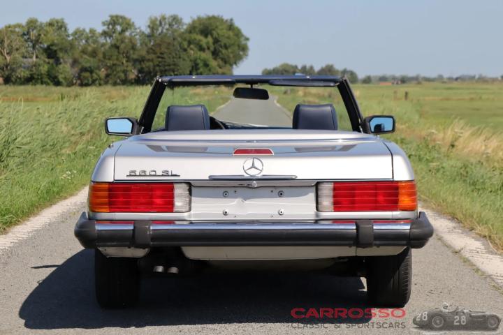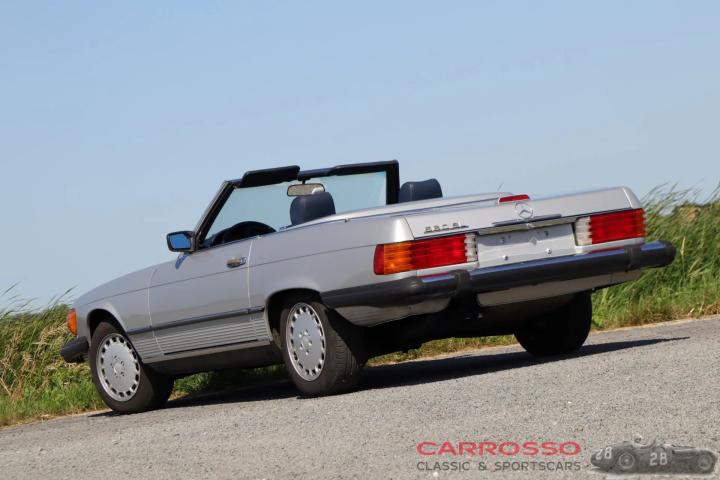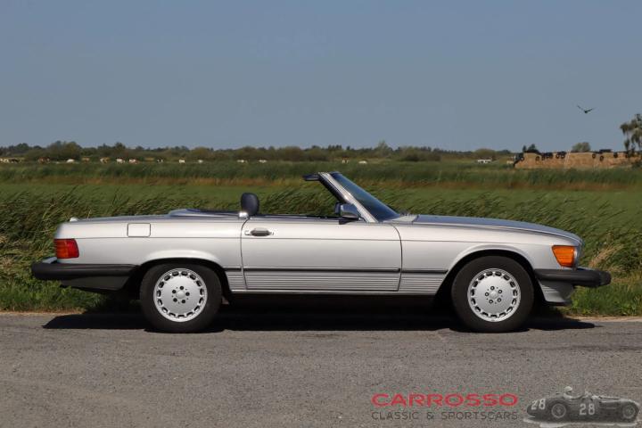 Het gaat hier om een Mercedes-Benz SL 560 uit 1987. De 560 staat voor de 5.6 liter inhoud van de motor, een V8. Hiervan zijn er nog geen 50.000 stuks geproduceerd, en waren alleen uitsluitend leverbaar aan de Amerikaanse, Japanse en Australische markt. Onze desbetreffende Amerikaans-model cabriolet is uitgevoerd in een nette 'Astral Silver Metallic' tegenover een 'Royal Blue Leather' interieur. Voor de rest is het interieur blauw velours bekleed samen met witte hemelbekleding, elektrische ramen & spiegels, houten middenconsole, achterruitverwarming en zijn originele Becker Grand Prix radio.