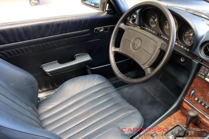 The car in question is a 1987 Mercedes-Benz SL 560. The 560 stands for the engine's 5.6-litre capacity, a V8. Less than 50,000 of these were produced, and were only available to the US, Japanese and Australian markets. Our corresponding American-model convertible is finished in a neat 'Astral Silver Metallic' opposite a 'Royal Blue Leather' interior. Otherwise, the interior is blue velour upholstered along with white headliner, electric windows & mirrors, wooden centre console, rear window heater and its original Becker Grand Prix radio.