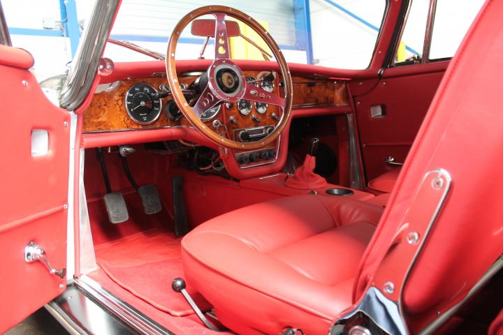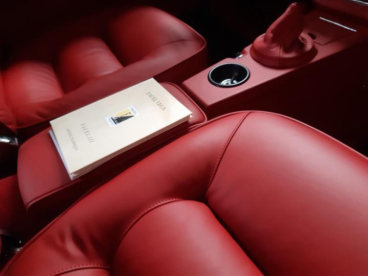 Het dashboard is, zoals Facel Vega dat deed in het verleden, geschilderd in houtnerf op alu ondergrond.
