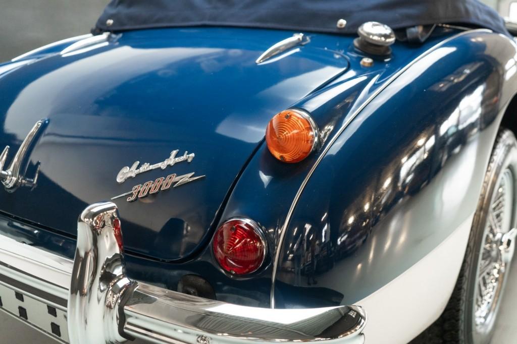 The Austin Healey 3000 MKIII, with its elegant lines and polished aesthetics, personifies the golden age of British sports vehicles. This specimen has a beautiful two-tone paint scheme in blue and white that is in good shape. The chrome trim is all present and well-preserved, which enhances the car's overall attractiveness. With its beautiful proportions, this Healey is a great eye-catcher.