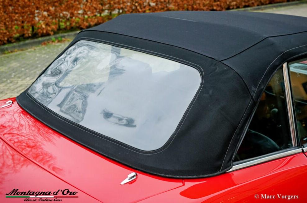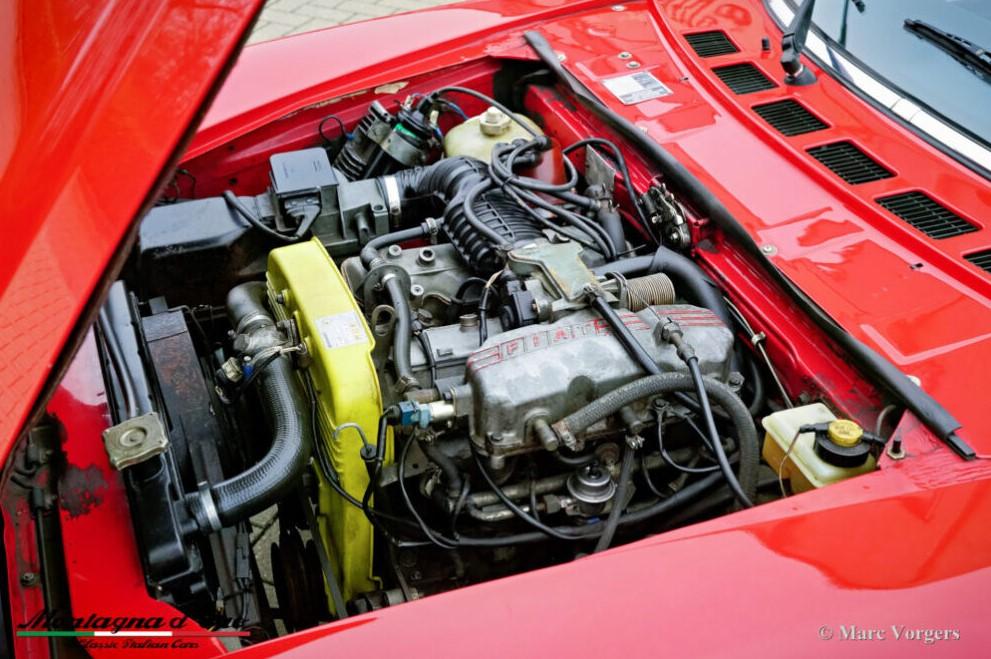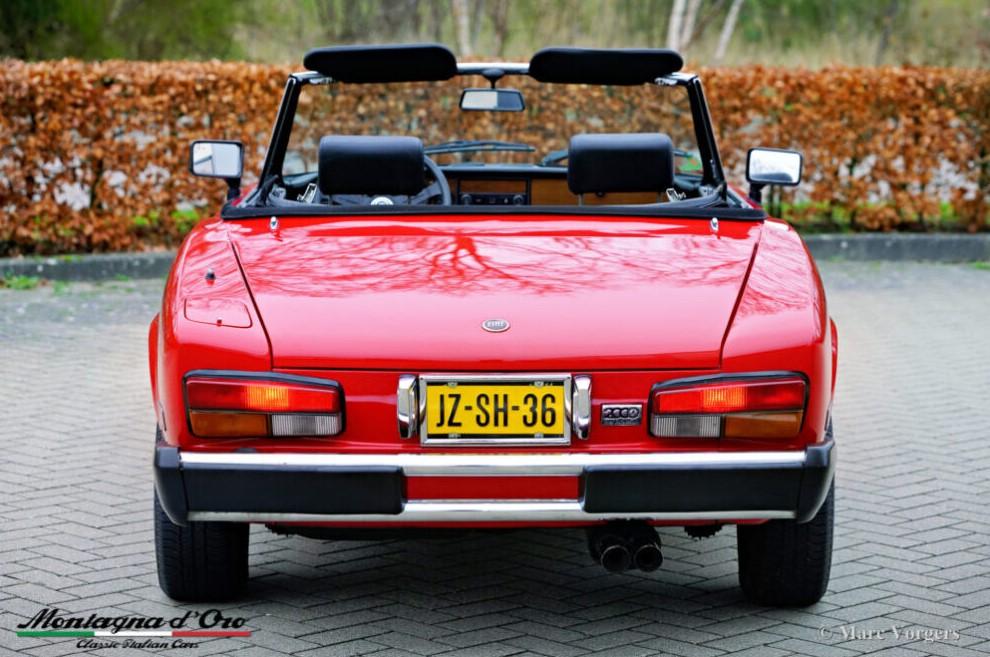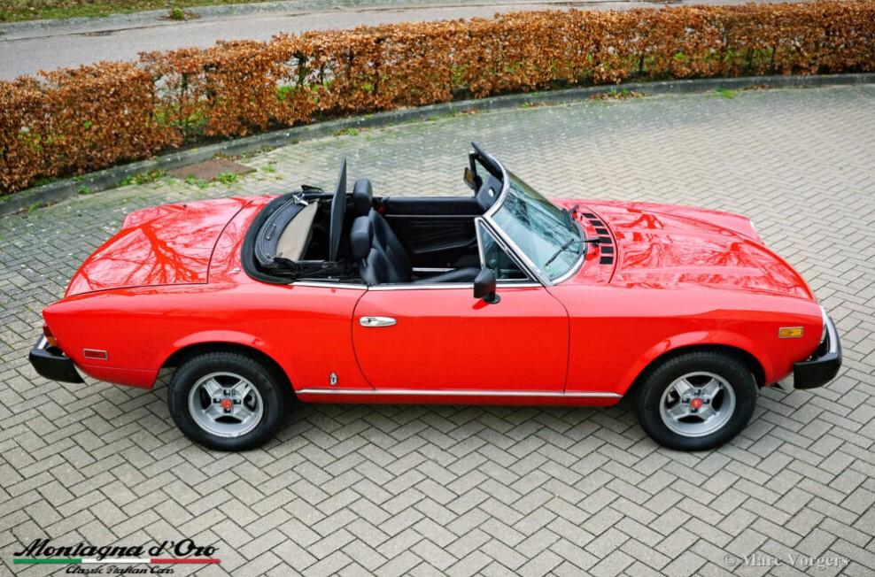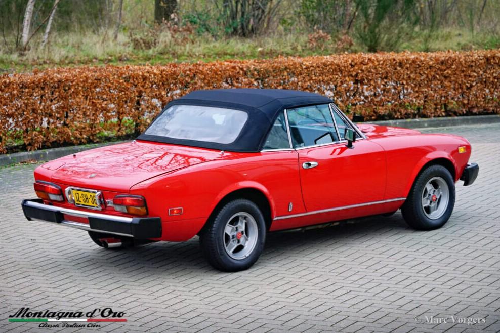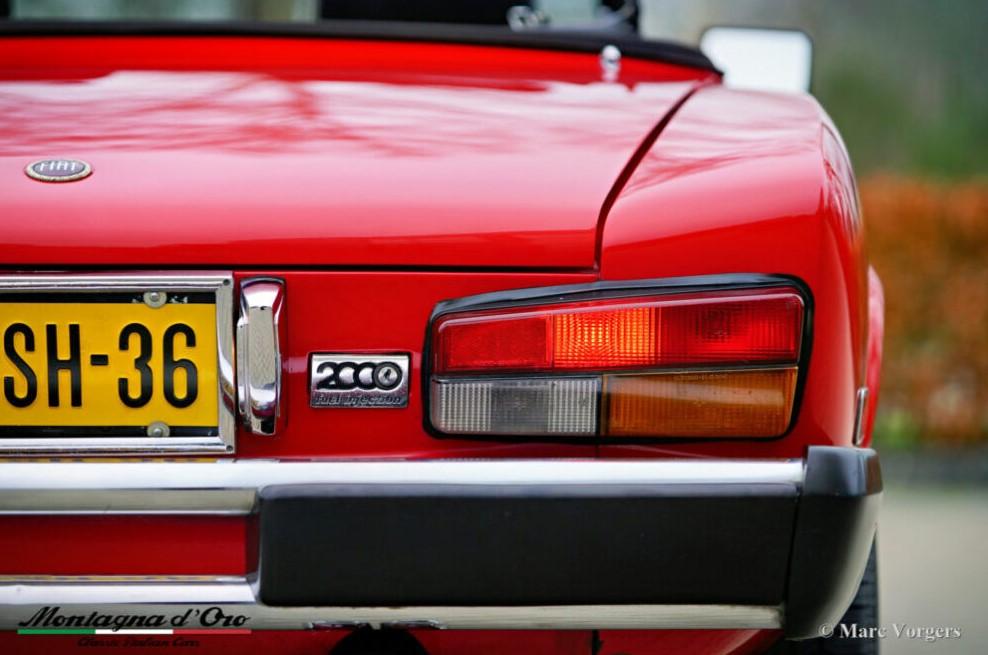 Bouwjaar 28-02-1980. (Eerste registratie 28-02-1980). Chassisnummer ZFA124CS000168676, motornummer FF132CB 4371507. Kleur rood gecombineerd met een zwartlederen interieur en zwart tapijt. Zwarte soft-top. Deze fantastische Fiat 124 2000 Spider is in 1995 naar Nederland geïmporteerd.