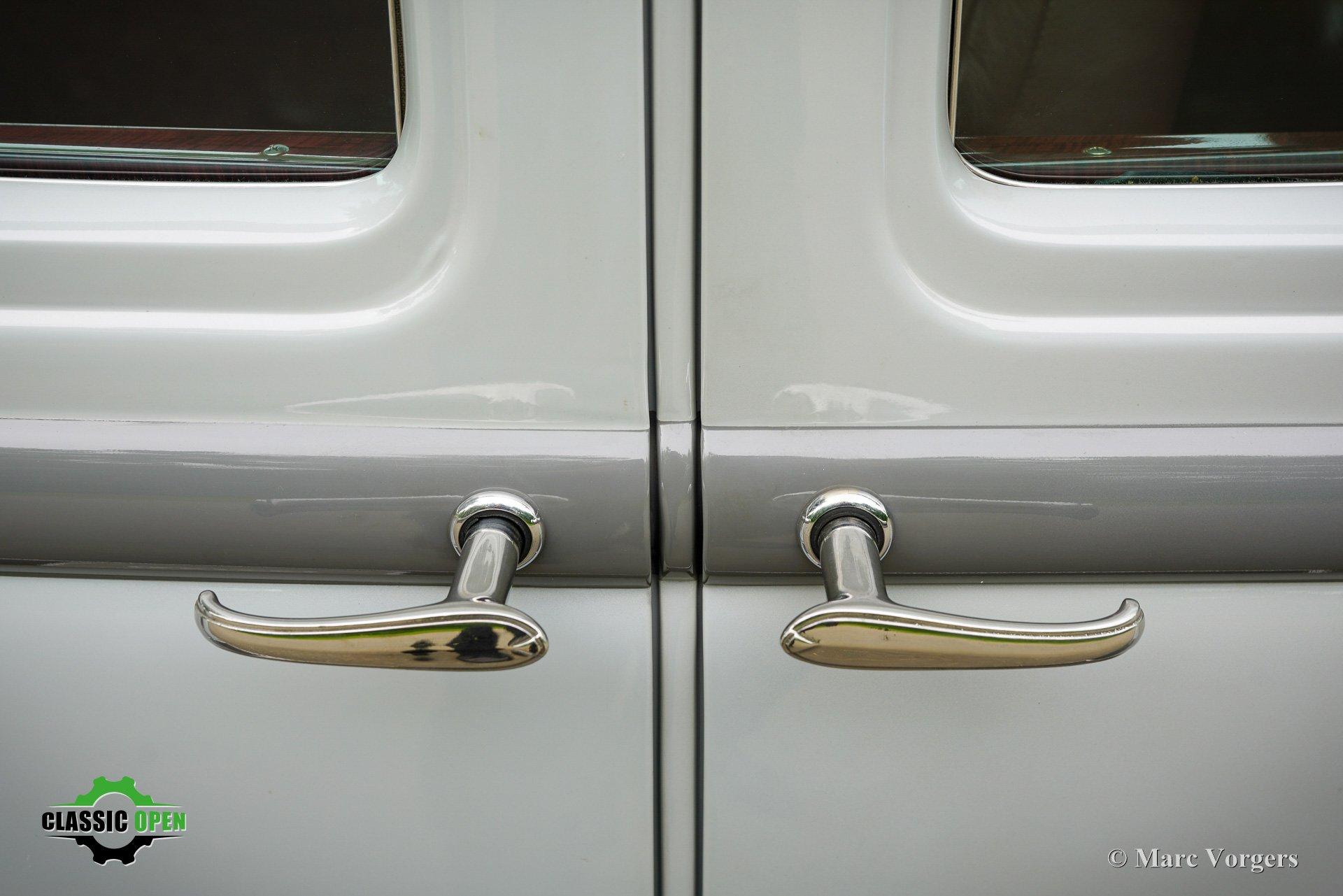 Afgewerkt in tweekleurig grijs met een bordeauxrood lederen interieur (compleet met bijpassend tapijt en hemelbekleding). Deze vierdeurs sedan met zeven ramen is uitgebreid gerestaureerd en gemodificeerd in de VS.
