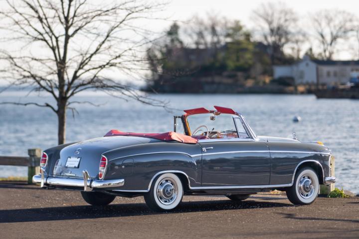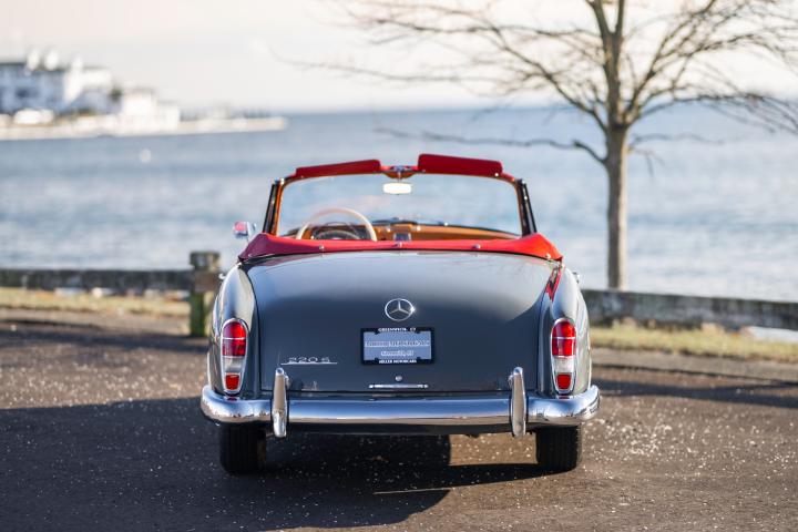 This beautiful specimen on offer was, according to the original receipt, picked up at the factory in Stuttgart on 12/06/1959 by the happy Californian owner. According to the fully completed and stamped service booklet that comes with the car, the owner has made a road trip through Europe, which can hardly be disappointing in a 220S. on 11/09/1959, according to custom's papers, the car was finally transported to California where the first owner maintained the car with a lot of love and care and remained faithful to it until 2017. Needless to say, California Classic cars are the best on the market, due to the dry and warm climate, making this 220S arguably the most excellent on the market. This 220S was finally registered by its second owner in Belgium, in 2017. Although this car was still in perfect condition, it underwent a complete ' nut and bolts' restoration to absolute competition condition, with an eye to the original configuration. For example, the bottom plates were retained. According to the data, the chassis and engine numbers are matching. which is very difficult to find today. In addition, this car is equipped with optional 4 seats, of which the seats are optionally adjustable, which makes this 220S Cabriolet extremely rare.