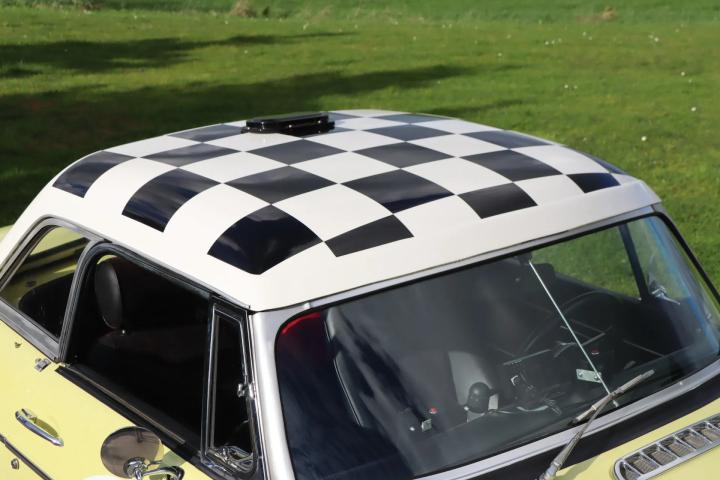 A sporty appearance: a subtle yellow colour (Primrose Yellow) of the paintwork, the well-known “Mini-Lite” alloy wheels with central wheel nut, a “Sebring” front spoiler and, of course, the absence of chrome bumpers and the addition of stickers, which make it a real rally car. Of course, the original parts are included with the car, such as the chrome bumpers, front lip and seats. Both the striking black and white chequered polyester hardtop and the black fabric soft top are in good condition. The body parts fit together correctly. The windows, rubbers and chrome work are also in good condition. There are only slight signs of wear. The front features four Cibie fog lights/spotlights and the sides feature Union Jack emblems. Additional fog lights and mud flaps are mounted at the rear. The headlights have protective covers. The car also comes with several seat belts (3-point and 4-point), a cover for the soft top, an extra boot lid with luggage rack and a roll bar.