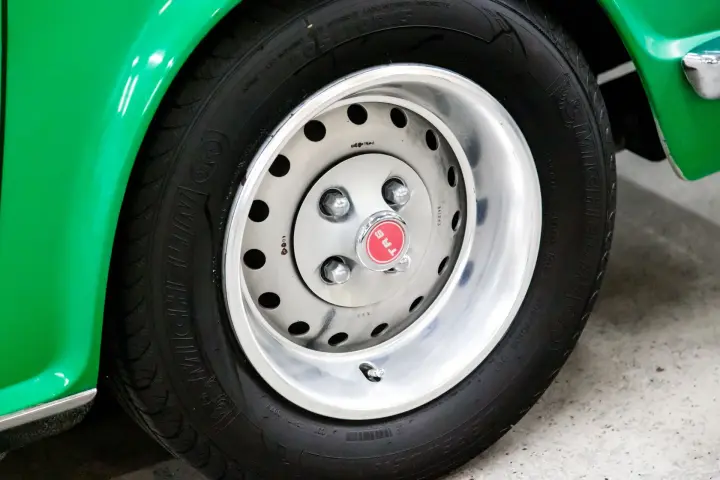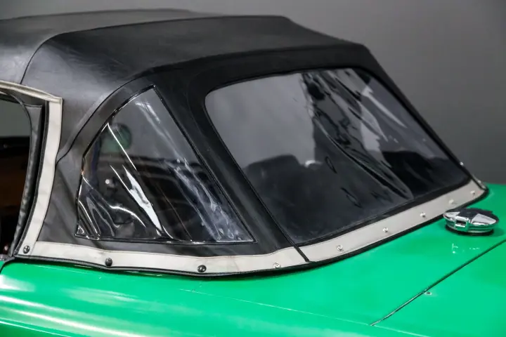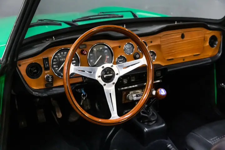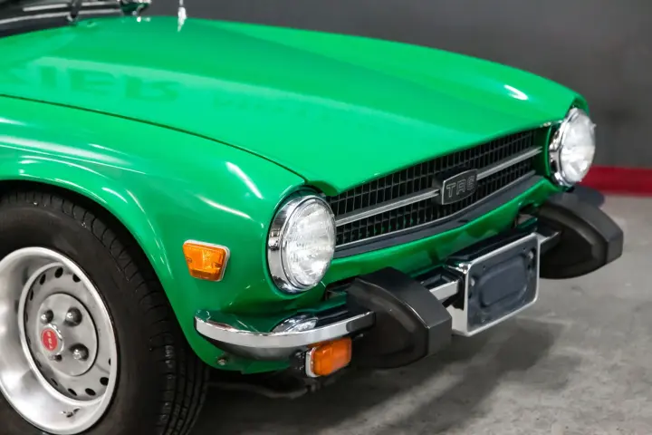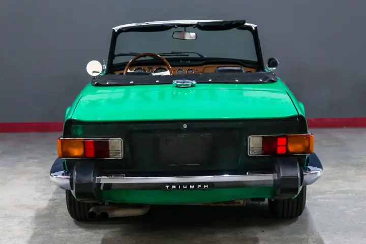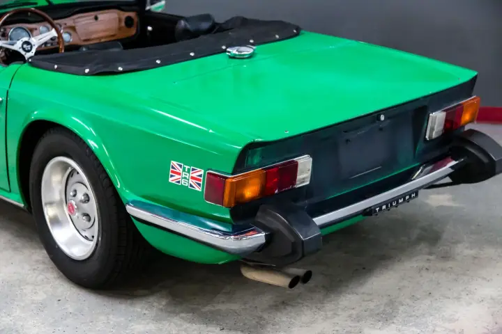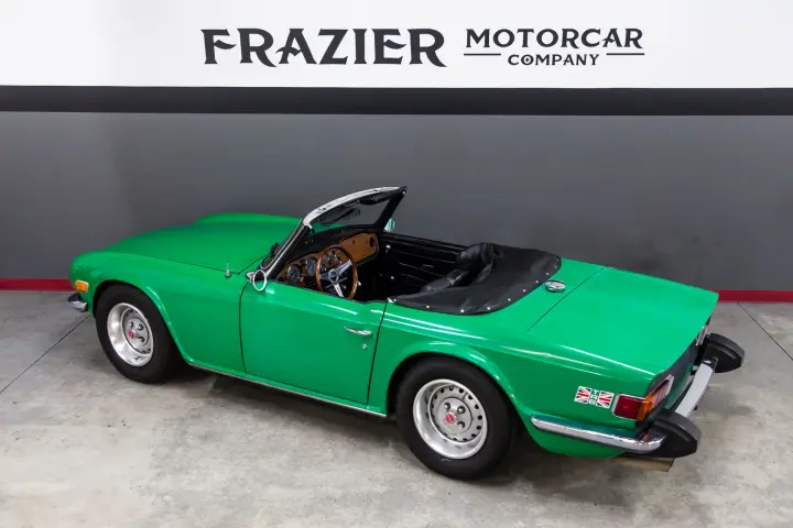 This 49574 mile Java Green TR6 is absolutely void of rust and rust history. The car shows no signs of accident history. The car is straight ,void of rust with mostly original paint with patina. The body gaps are absolutely as they came out of the factory, straight body panel gaps with straight body panels. The wood dash is in need of refinish but dash cap and knee pads are straight and crack free. The gauges are in good order ,crisp ,clean, and work as designed. The suspension is tight ,clutch ,transmission ,and engine all perform as designed. The engine is dry and performs with no smoke and high oil pressure. The soft top is in good condition with the correct reflective ban.