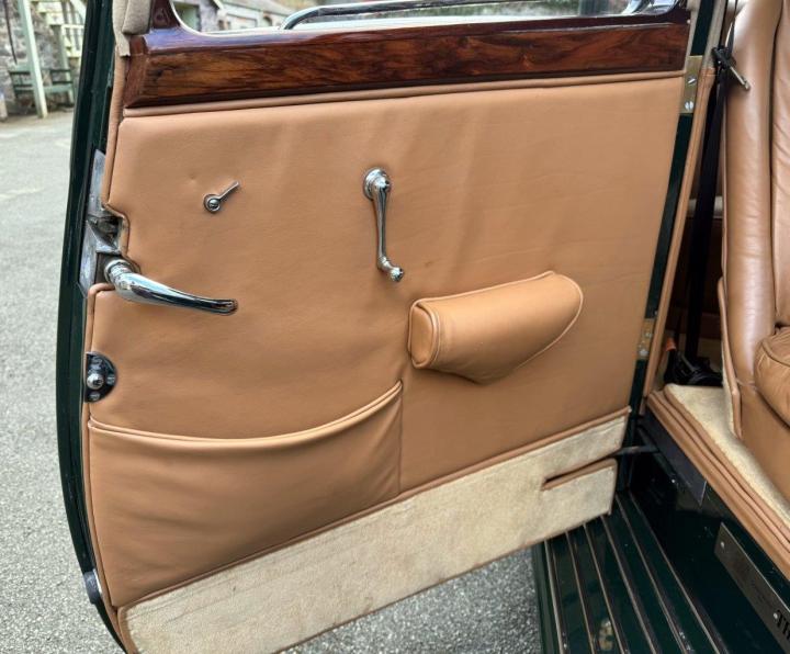 A particularly handsome car, very attractively finished in dark green with tan leather interior, and in lovely, smart and sharp condition. The paintwork is to a high standard, the leather is excellent, as is the headlining, and the interior wood veneers are particularly lovely, with a superb finish. Features include P100 ‘bullseye’ headlights (unusual for a Derby Bentley) and handsome ‘trouser crease’ wings. The car comes with a significant maintenance and repair history file, two large folders worth, going back to the 1980s, showing a great deal of expenditure, together with various literature, and an original handbook in lovely condition. There is also a selection of spare parts included. It is apparent just from looking at the car that it has been well cared-for. Running and driving very nicely, and fitted with overdrive, which really improves long-distance cruising, making the experience much more relaxing. Also fitted with three-point inertia reel seat belts, which is unusual for a coachbuilt car. MoT tested until January 2027, serviced, and ready to go!