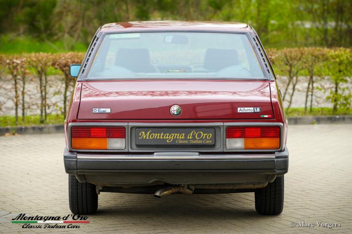 Alfa Romeo Alfetta 1.8 Berlina, jaar 1984 (eerste registratie 27-04-1984). Chassisnummer * ZAR01687 * 08520X *, motornummer AR01678 * 08520X *. Kleur Rosso Veneziano 536. Deze prachtige Alfa Romeo Alfetta werd nieuw verkocht in Italië. De auto is onlangs gekocht van de eerste eigenaar, de heer Giuseppe uit Ragusa. Deze Alfetta 1.8 Berlina verkeert in een fantastische en volledig originele staat en de auto heeft vanaf nieuw slechts 69.706 kilometer gereden. De Alfa Romeo Alfetta is een sportieve klassieke sedan met mechanische details van een sportwagen … Een aluminium viercilindermotor met dubbele bovenliggende nokkenassen, een 5-traps “transaxle” -versnellingsbak vlak voor de achterwielen voor 50-50 gewichtsverdeling, schijfremmen rondom en een de-Dion achteras. De auto rijdt, stuurt, en remt perfect! De automobiel verkeert in excellente originele conditie! De carrosserie is perfect en toont zijn originele lak, het interieur vertoont nagenoeg geen gebruikssporen. Deze prachtige Alfa Romeo Alfetta 1.8 Berlina wordt geleverd met de originele boekjes en twee sets sleutels. Een zeldzame vondst voor de Alfa Romeo liefhebber en/ of verzamelaar!