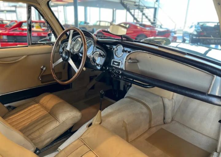 The inside of the car is just as beautiful. Especially considering the unique fact that this is an original first interior. The leather has a beautiful patina, the carpets are in good condition, as is the dashboard and instrument panel. The headliner is covered with felt which is also in very good condition. Things such as the steering wheel and the gear lever for the transmission are also completely original and look beautiful.