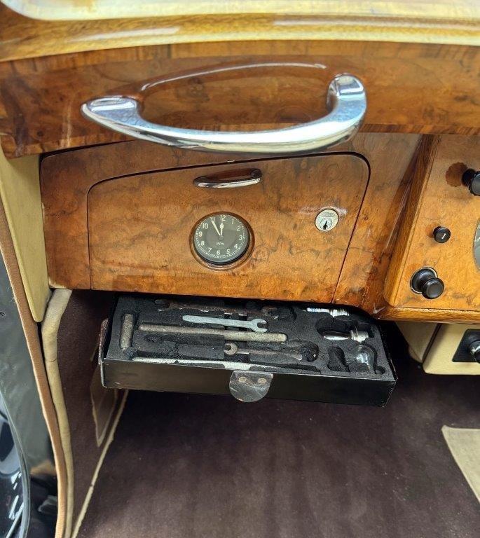 An R Type with a difference! The car has been upgraded to 4.9 litres, has a high ratio back axle and is equipped with P100 headlights, all of which enhance the car overall and make it stand out from the crowd visually, as well as adding to the already highly useable specification of these models. In lovely condition, with excellent paintwork in Mason’s black and grey, superb chrome plating, with original leather interior, accompanied by high quality carpets, headlining and woodwork, all in lovely order, and looking very smart. The underside is excellent, being clean, sound and well-protected, and includes a recent stainless steel exhaust system. Driving nicely, fitted with very well-suited Avon radial tyres & offered freshly MoT’d.