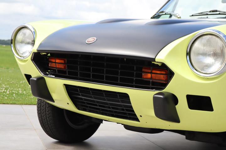 The beautiful design is still as attractive and timeless as ever. Characteristic of this type are the bumps on the bonnet. The Pininfarina emblem adorns the side. The beautiful striking yellow colour “Giallo Pagoda” (repainted paintwork) contrasts beautifully with the matt black bonnet and boot and gives the car a sporty look reminiscent of the Abarth version. The absence of the front bumper also contributes to this. The paintwork is in good condition. The car has alloy wheels. The black soft top is free of tears and also in good condition. The lines of the car are beautiful and we have not been able to find any rust on the car.