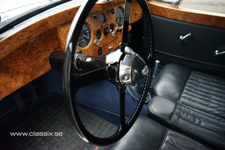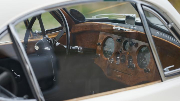 Interior: Inside the XK120 FHC, we find dark blue leather and carpeting in the same color. All the beautiful wood panels in the car are new. The instruments have been revised, and once you’re seated behind the large steering wheel, you’ll feel ready for a long, comfortable drive. The 1954 Jaguar features a clever design, with a small flap on the side of the car allowing cool air inside. When you also open the small screens at the back, the air flows through the car, keeping you cool even on hot days.