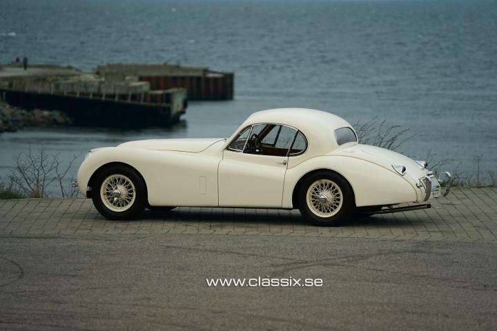 Exterior: The Jaguar XK120 M we have for sale today is a striking car in white. It looks a bit sportier than the standard XK, with its lower ride height and wire wheels. The paintwork on this car is absolutely stunning, as are all the chrome details. All panel gaps are perfect, and the doors open and close effortlessly, even with new rubber trim. The teardrop design and split front screen of the Jaguar XK120 Coupe reminds you of the style of exclusive French cars from the 1940s. The spoke wheels are in good condition and fitted with Michelin Pilote X tires, which are the best available tires for these cars.