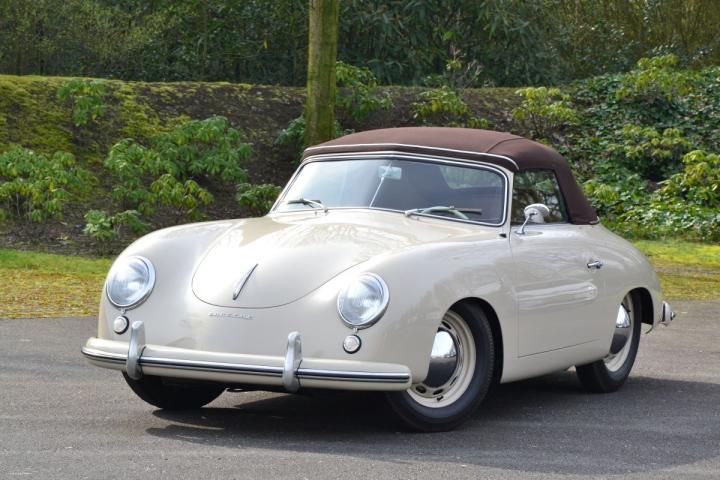 Zeldzame pre-A Knickscheibe van Porsche, een van de slechts circa 1.300 gefabriceerde cabriolets, prachtig gerestaureerd en in een bijzondere en originele kleurencombinatie. Het Sandgrau met het rode lederen interieur en de lichtbruine kap geven de auto een mooie jarenvijftiguitstraling. Dit is een van de laatste Knickscheibe cabriolets zonder de claxonroostertjes, wat deze Porsche krachtig in zijn eenvoud maakt en daardoor erg begeerd.