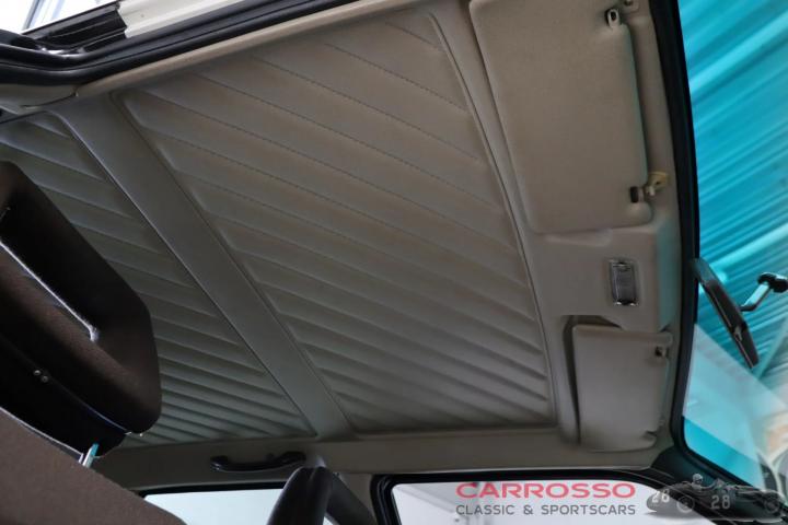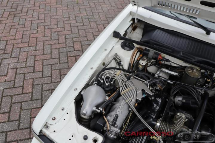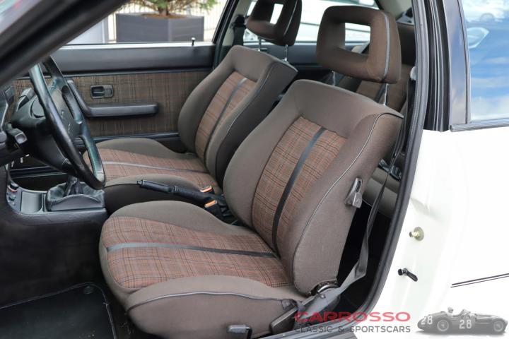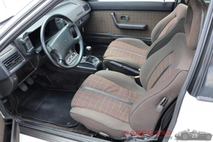 Our 1984 Audi Quattro is finished in a beautiful 'Alpine White'. This paint makes a nice combination together with the checkered brown fabric upholstery and the 15-inch white wheels. Both the paint and the upholstery are in very clean and original condition. It has a grey skai leather headlining.