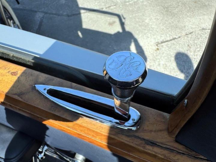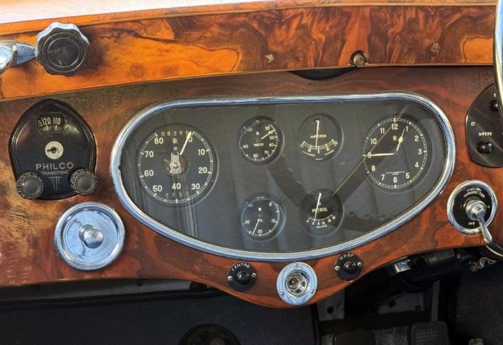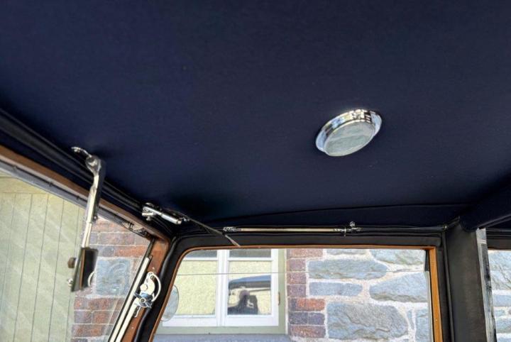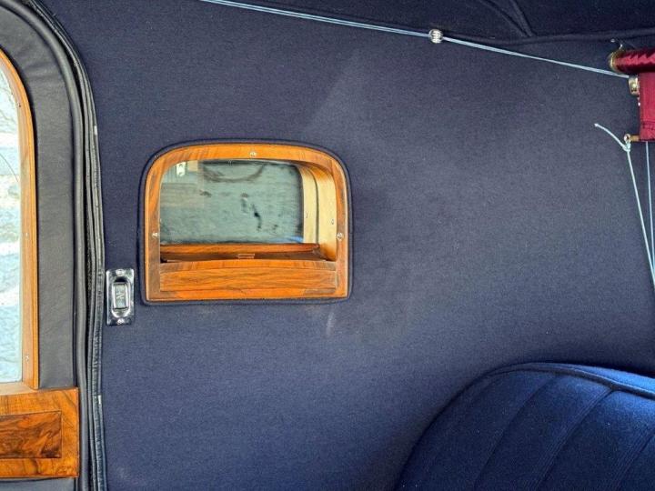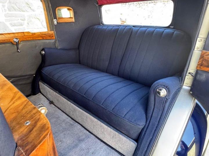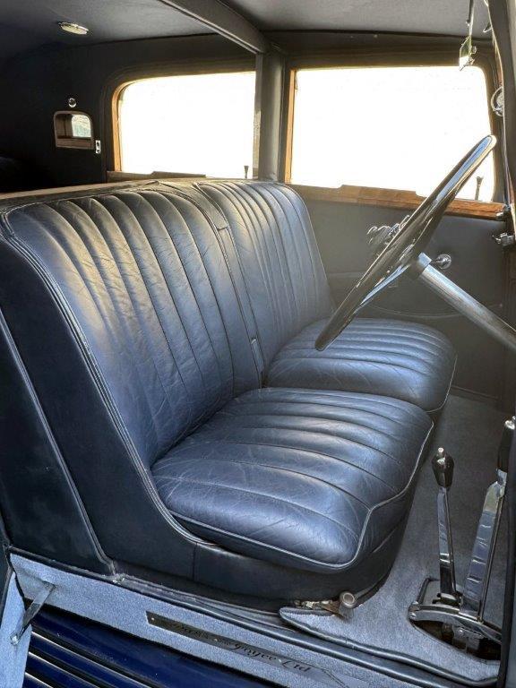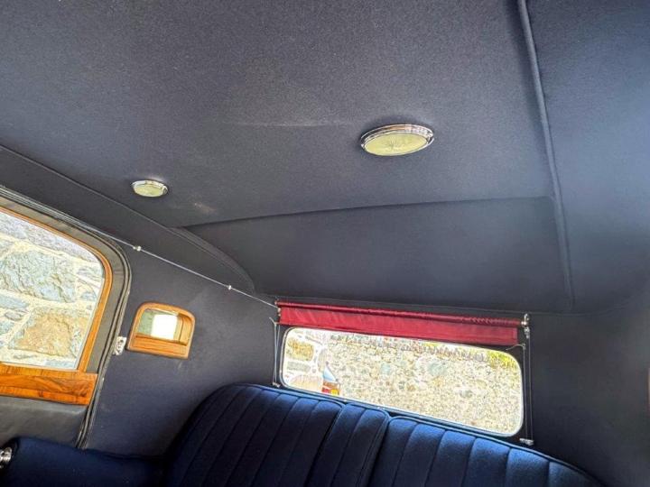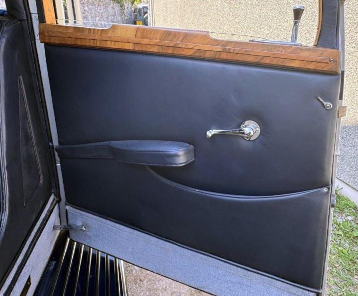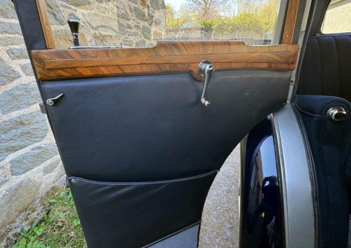 A smart, clean and handsome example, very nicely finished in silver, with wings and waistline moulding in a lovely shade of blue. The interior consists of excellent leather to the front, cloth to the rear & the headlining all in deep blue, with light blue carpets & particularly attractive wood veneers – all work together to create a very unusual and pretty combination. All in fresh, smart condition & to a high quality. Appealing features include ‘trouser crease’ wings, an original Philco ‘Transitone’ radio control on the dashboard, flashing indicators incorporated into the existing sidelights and taillights, as well as trafficators worked from a different switch. Mechanically very good, running and driving nicely, clutch just overhauled and various other preparation works carried out. Offered newly MoT tested.
