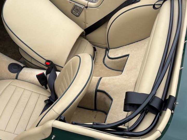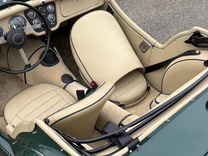 British Racing Green met een beige leren interieur en een beige soft-top.