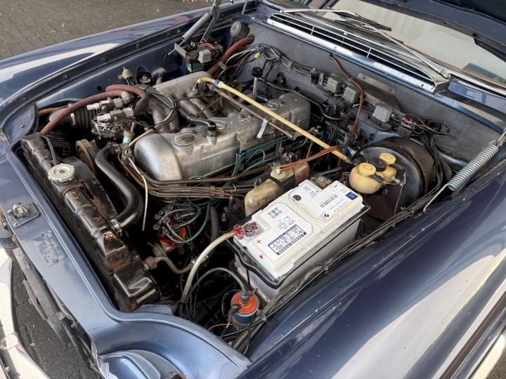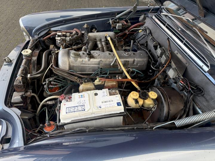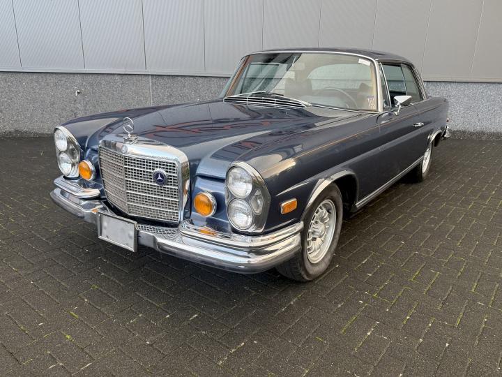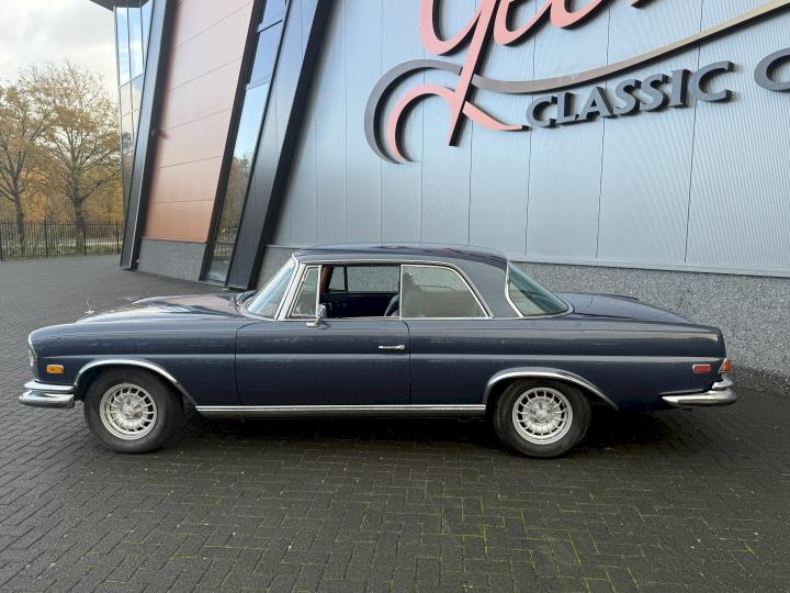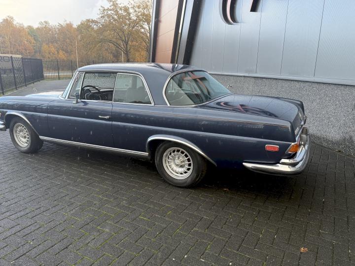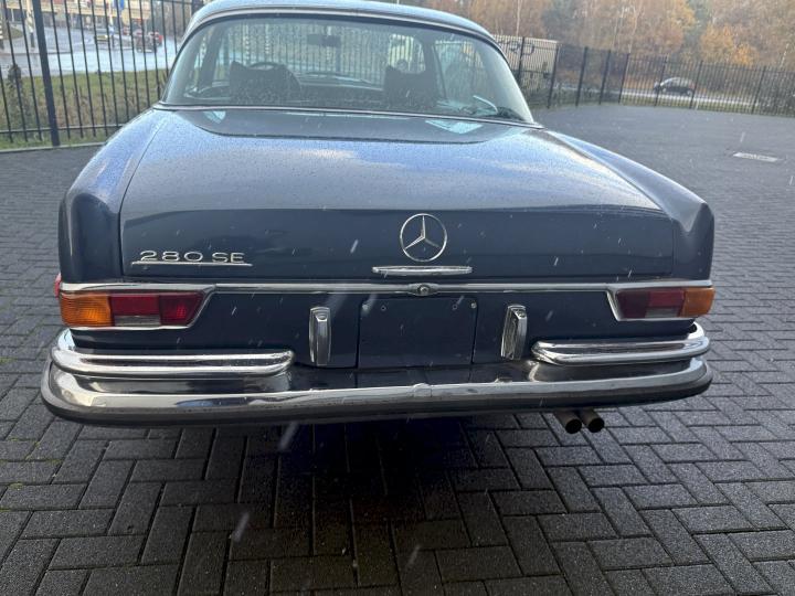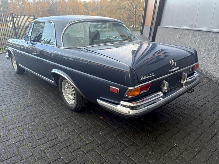 Het betreft een Matching nummers Lage grille (Flachkühler) 280SE Coupe, alleen geproduceerd in 1970/71, af fabriek geleverd in lichtblauw metallic 906G en in het verleden gewijzigd in Donkerblauw metallic 387H, het lakwerk is redelijk en hoeft niet vervangen te worden, een auto die goed loopt en rijdt, betreft een automatic transmissie met de handle op de tunnel en niet aan de het stuur, het leder interieur is best vrij aardig, zo ook tapijt en binnen hemel, voorzien van de originele Becker radio, qua body in zoverre ik kan zien geen schade gehad in het verleden, voorzien van het juiste type bumpers, de kofferbodem hoeken zijn in het verleden vervangen, de hoofd kofferbodem, achter tussen-paneel en achter schermen zijn nog de eerste en origineel, aan de onderzijde kan ie wat verbeteringen gebruiken, niet zo zeer de hoofdbodem delen, te denken is dan aan de voorste krik steunen, links voor de binnen scherm versteviging (banaan genoemd), en l + R een liggend gedeelte net voor het achterwiel.