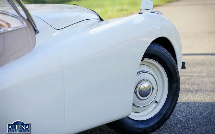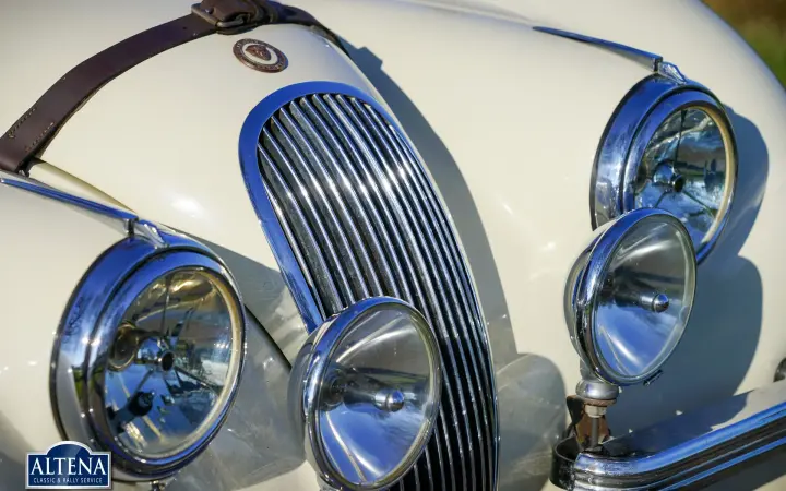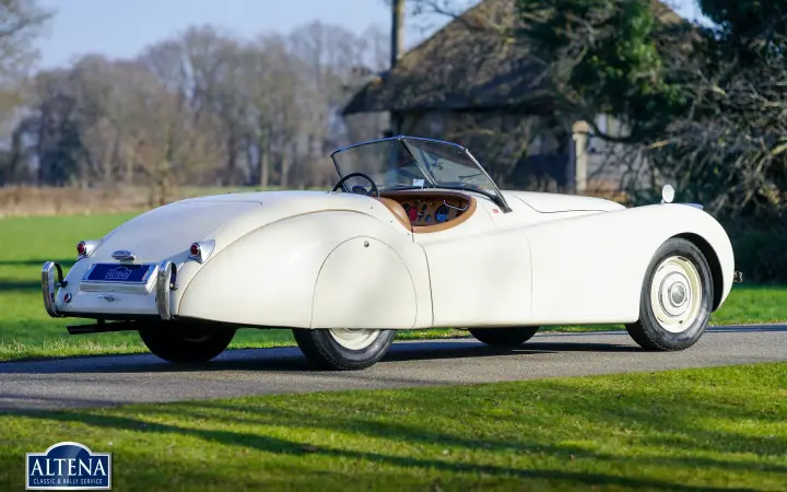 Jaguar XK 120 Alloy MILLE MIGLIA Roadster, year 1949. Chassis number 670062, engine number W1161-7, gearbox number JH1350. A Heritage Certificate is available confirming that the chassis and engine are factory original ('matching numbers'). The cylinder head has been replaced in the past. The cream-colored exterior and dark beige leather interior are almost identical to the color scheme in which the car left the factory in 1949. The Jaguar XK 120 Alloy is a historically significant collector's car that marks the introduction of the legendary Jaguar XK six-cylinder engine with twin overhead camshafts. The Jaguar XK 120 was designed as a 'test bed' for the new XK engine. Presented at the 1948 London Motor Show, the car's performance figures (120 mph guaranteed top speed) and stunning open two-seater (OTS) design caused a sensation, leading Jaguar founder and chairman William Lyons to put the car into production. The first 242 cars were fitted with hand-made aluminium (alloy) bodies before production of cars with pressed steel bodies began in 1950. On 30 May 1949, the Jaguar XK 120 became the fastest production car in the world with a speed record of 132,6 mph on the motorway at Jabbeke in Belgium. This rare Jaguar XK 120 Alloy with chassis number 670062 is car number 62 of the 242 'alloy' cars built. This XK 120 Alloy is one of 184 built with left-hand drive. The car was sold new in Cairo, Egypt in December 1949. In 1996 the car was extensively restored, invoices that provide a good insight into the work carried out are available. In the late 1990s the car was owned by Mr. GR Lang, founder of Chronoswiss, the renowned watch manufacturer. During this period, the XK 120 Alloy played a major role in the company's promotional material. In 1999, the XK 120 took part in the Silvretta Classic Rallye Montafon in Austria, where it won first prize. The car subsequently won another prize at the German Bensberg Classic. In 2003, the Jaguar XK 120 took part in the prestigious Mille Miglia Storica. The full history of the XK 120 is known and contained in two large binders. This rare and highly sought after Jaguar XK 120 Alloy is in good condition with a beautiful patina. The six-cylinder XK engine runs strongly and the Moss four-speed gearbox shifts as it should. The driving experience and all the senses of speed and sound are magnificent; this XK 120 Alloy is a wonderful time capsule. The car shows all the original details and is equipped with a pair of large Lucas SLR700 spotlights at the front, a leather belt over the hood and insert side windows with beige frames. The car comes with an FIA Historic Vehicle Identity Form and can be entered for any historic event in the world, including the legendary Mille Miglia. The XK 120 is not a very suitable car for very tall drivers. For them we have the option to install special bucket seats that create more legroom. The Jaguar XK 120 Alloy MILLE MIGLIA is the 'holy grail' of the world of Jaguar. This is a great opportunity to get your ticket to the crème de la crème of historic car events.