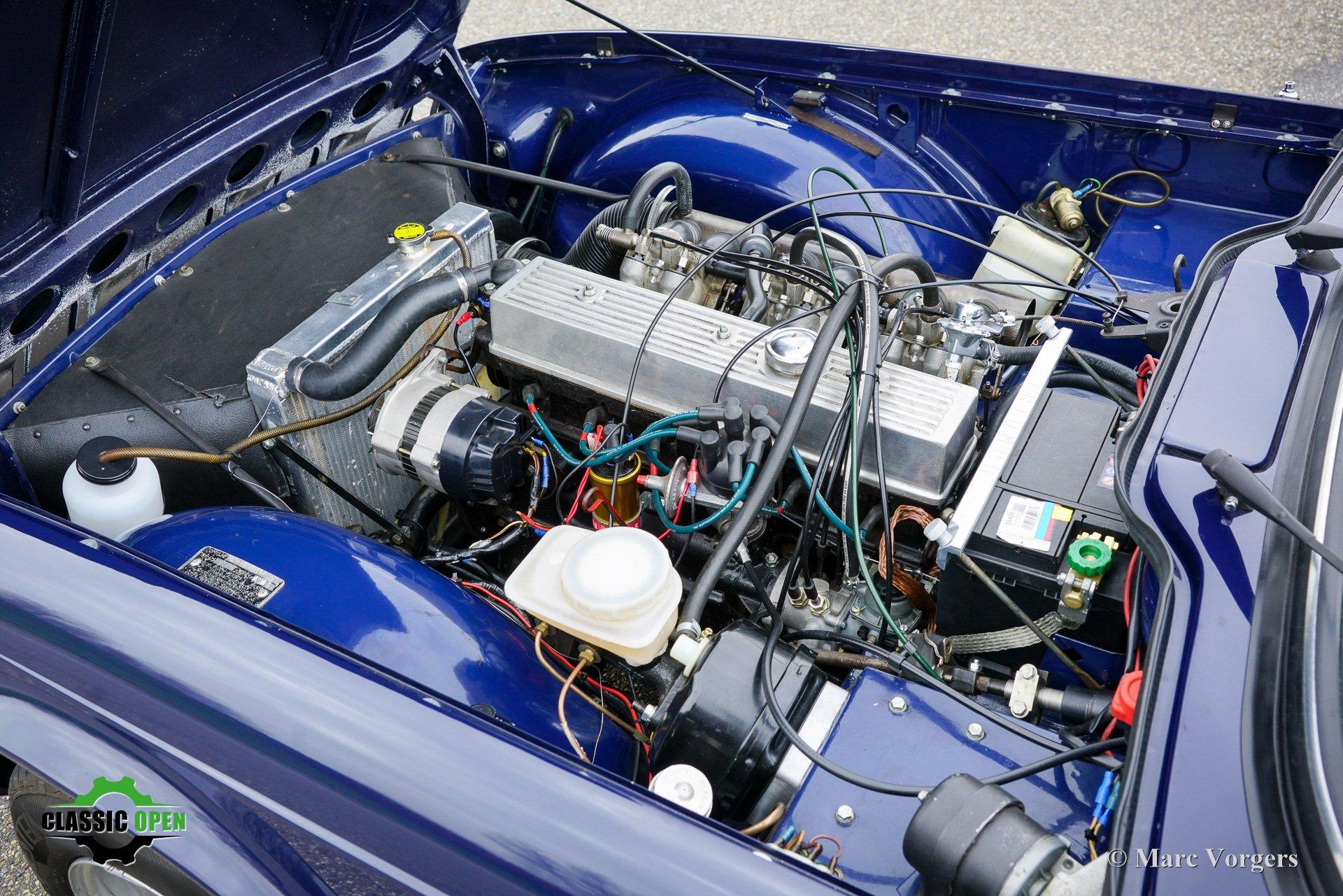 Exterieur uitgevoerd in donkerblauw, gecombineerd met een zwart interieur met zwarte lederen stoelen en zwarte vloerbedekking. Voorzien van een blauwe mohair soft-top en een zwarte vinyl afdekhoes.