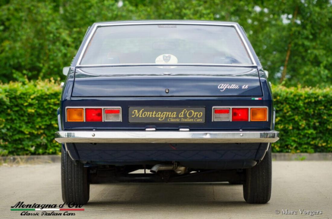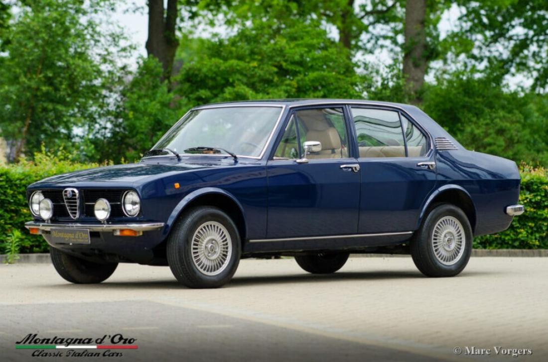 Alfa Romeo Alfetta 1600, jaar 1976. Chassisnummer AR*11600*00399XX, motornummer AR*01600*0561XX* Kleur donkerblauw (Bleu Olandese) gecombineerd met een beige kunstleren interieur, bruin tapijt en grijze beschermmatten met beige randafwerking. Toen de Alfa Romeo Alfetta in 1972 werd geïntroduceerd, was het de eerste middelgrote Alfa sedan in tien jaar. Alfa Romeo introduceerde de nieuwe ‘transaxle’ versnellingsbak tussen de achterwielen op de Alfetta die een bijna perfecte 50/50 gewichtsverdeling mogelijk maakte. Toegevoegd aan de volledig onafhankelijke wielophanging, de sportieve en krachtige aluminium twin-cam motor, de schijfremmen op alle vier de wielen en de vijfversnellingsbak was de Alfetta een echte sportsedan! De gepresenteerde prachtige eerste serie Alfetta is in Italië aangekocht uit de autoverzameling van de 2e Italiaanse eigenaar. De auto heeft onlangs een onderhoudsbeurt gehad in Italië, daarbij zijn de carburateurs gereinigd en gereviseerd. Dit super originele exemplaar verkeert in een zeer goede conditie met enige gebruiks- en ouderdomssporen in het interieur. De teller staat momenteel op 94.989 km. Deze fantastische Alfa Romeo Alfetta 1600 wordt geleverd met Italiaanse papieren en documenten (en een schild gemonteerd achter de achterruit) van de Auto Moto Club Storico Italiano. Dit is een moeilijk te vinden eerste serie Alfetta in prachtige originele conditie!