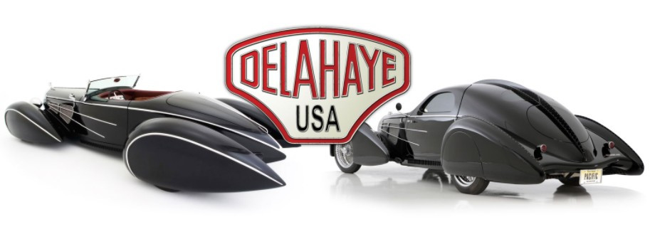 Our "Tribute" car has a convertible top with fixed windshield posts and working power windows installed so the car can have air conditioning. DELAHAYE USA fiberglass body kit ($12,900) mounted on our rolling chassis ($14,300). Beautiful folding top hides away completely in special boot between trunk and passenger’s compartment. Hinged trunk, hinged convertible top boot cover, hinged and latched doors. With a 127-inch wheelbase, ten inches longer than the original Bugatti, there is considerably more interior space. Headroom and legroom for a 6 ft. 10 in. basketball player. Shoulder to shoulder room for two NFL tackles.