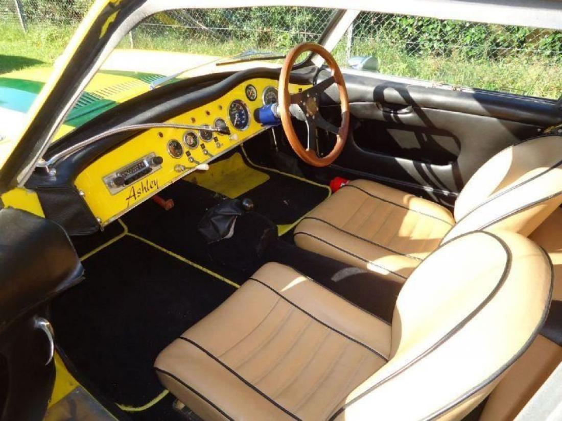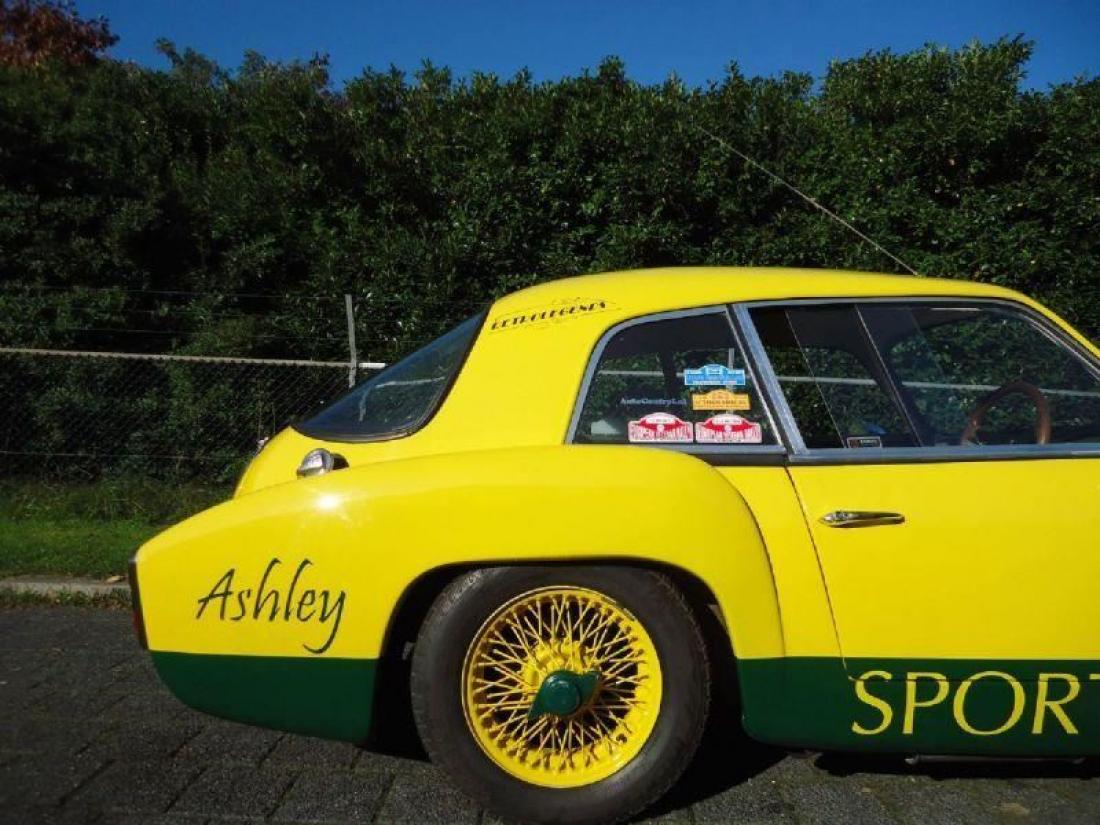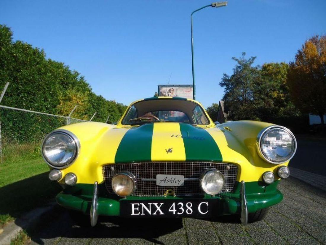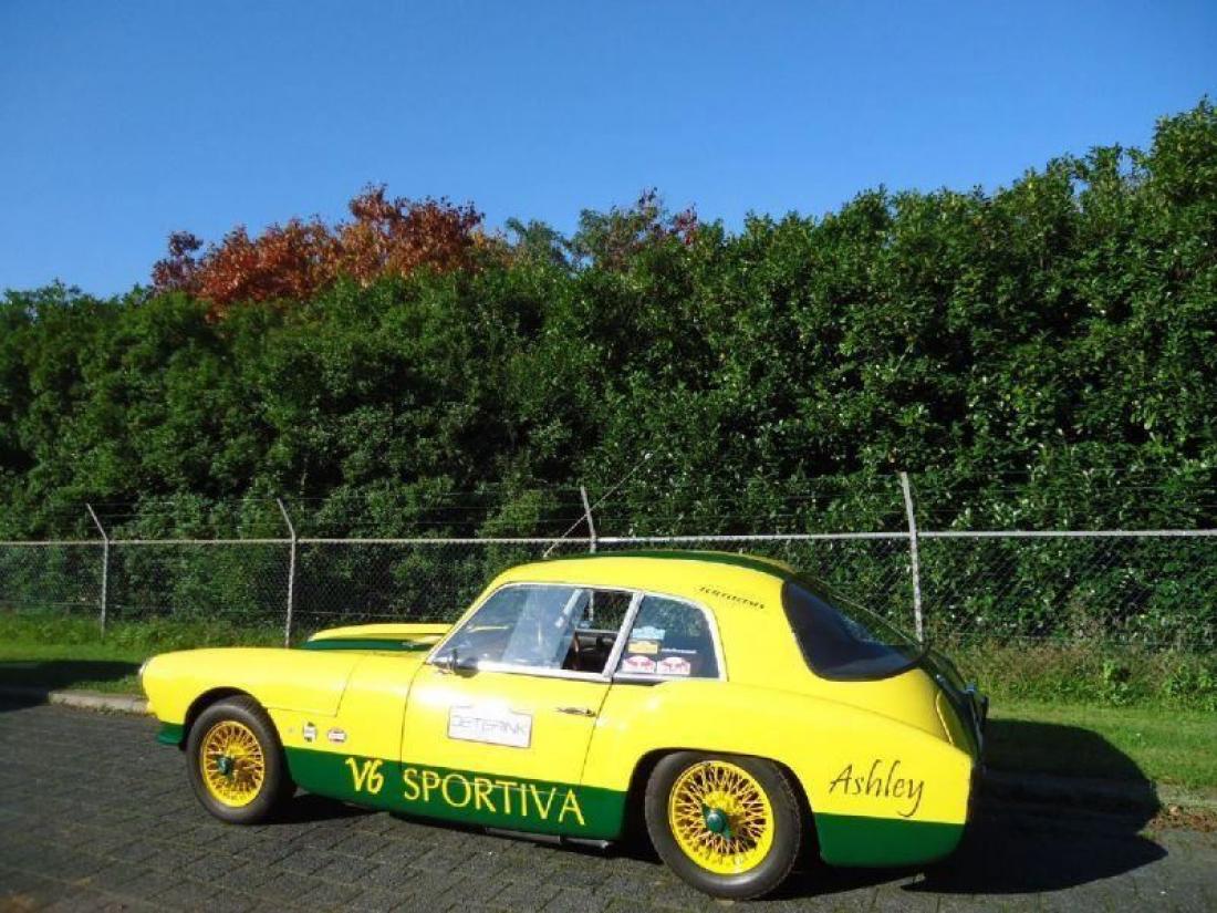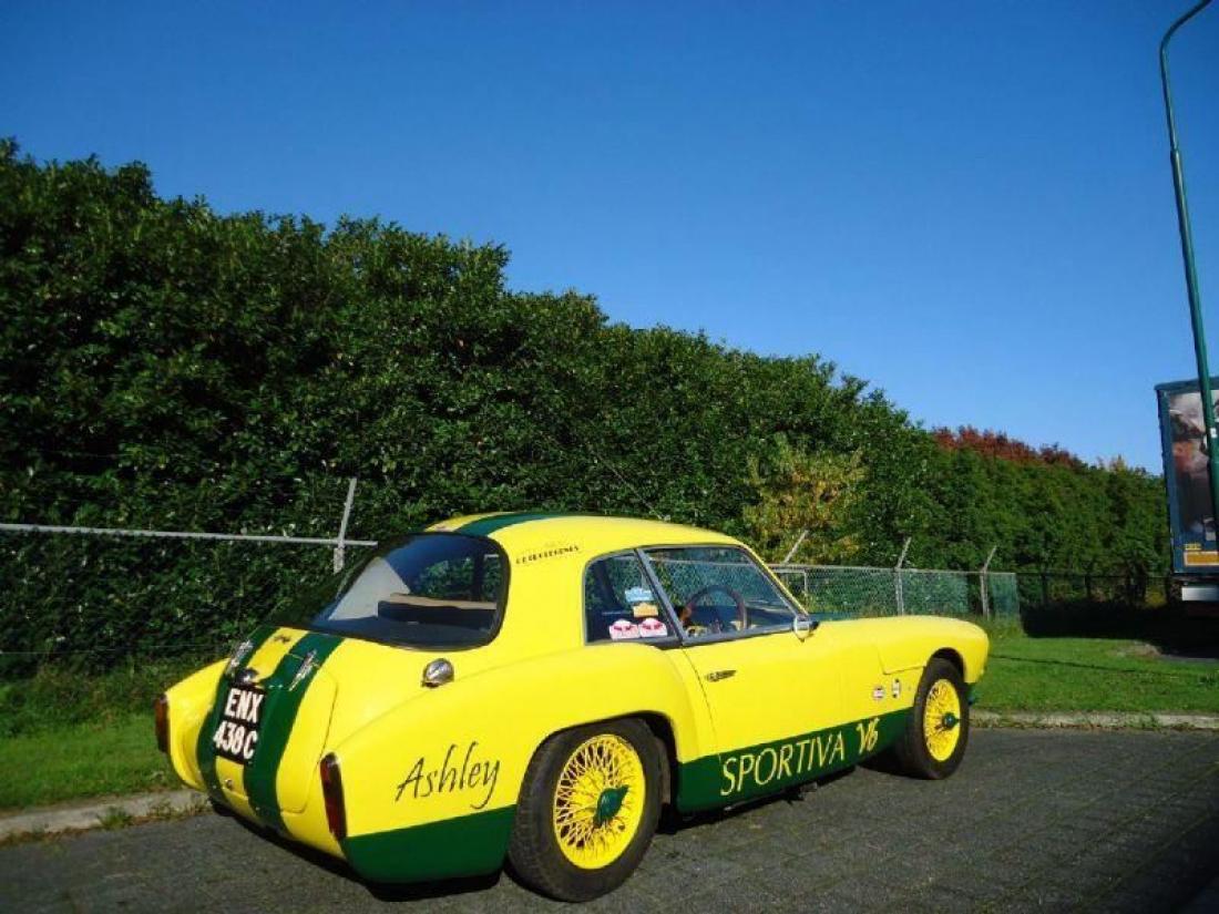 Een zeldzame Ashley Sportiva coupe van 1965 met de V6-motor en handgeschakelde 4-bak van Ford. Het gaat hier om een klassieke Engelse sportwagen waarvan van dit type slechts 72 stuks zijn gebouwd, nog steeds voorzien van de originele en reeds gereviseerde motor. De auto is nieuw in de kleur rood geleverd en toen de Ashley omstreeks 2003 gerestaureerd werd is gekozen voor de opvallende kleur geel, de nu aangebrachte groene tinten zijn geplakt dus eventueel ook eenvoudig te verwijderen.