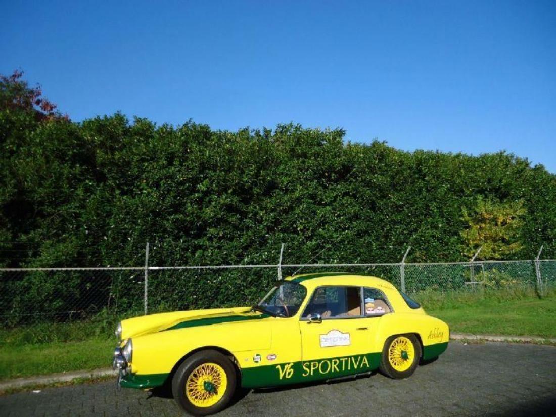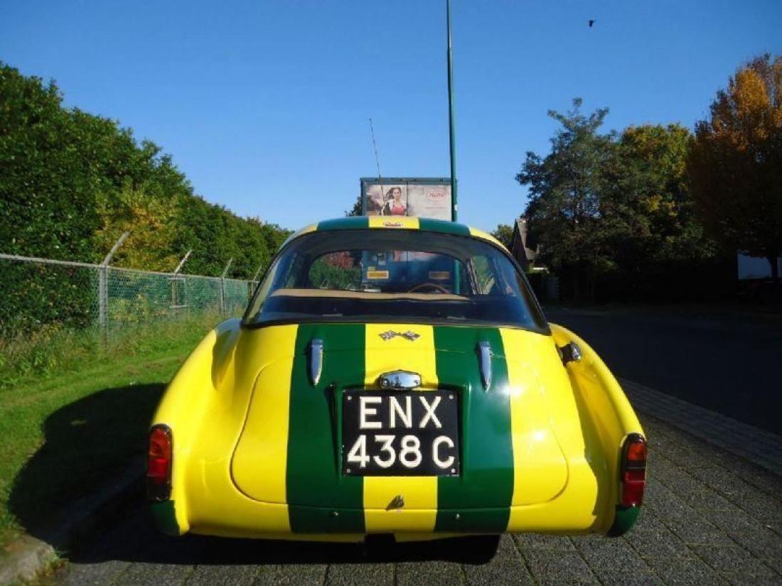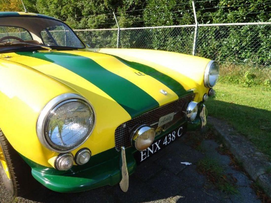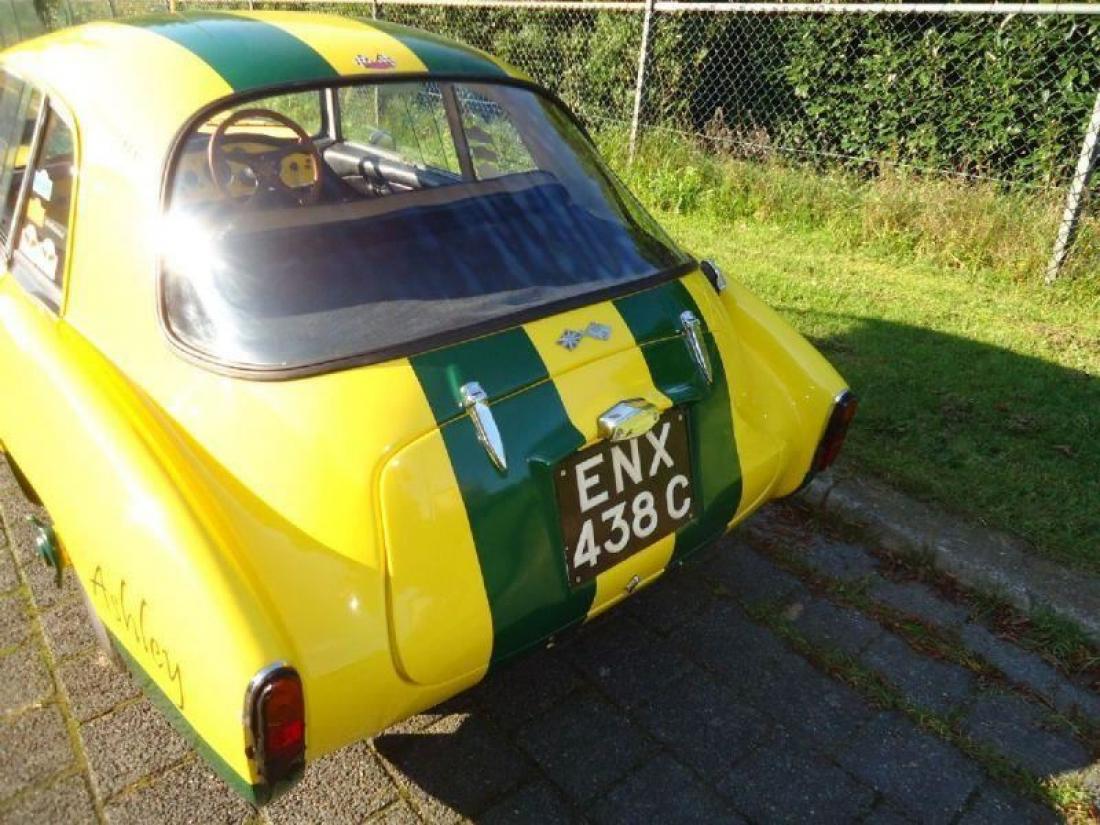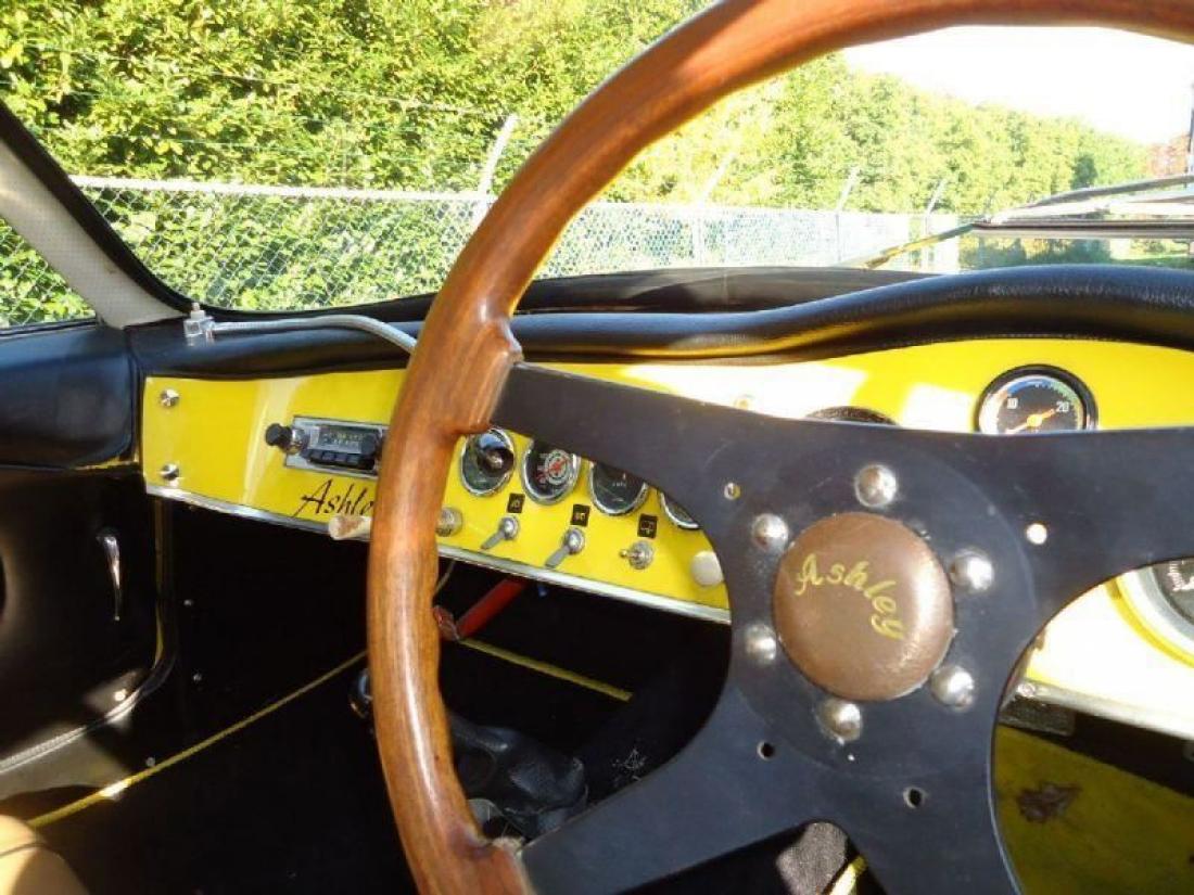 Een zeldzame Ashley Sportiva coupe van 1965 met de V6-motor en handgeschakelde 4-bak van Ford. Het gaat hier om een klassieke Engelse sportwagen waarvan van dit type slechts 72 stuks zijn gebouwd, nog steeds voorzien van de originele en reeds gereviseerde motor. De auto is nieuw in de kleur rood geleverd en toen de Ashley omstreeks 2003 gerestaureerd werd is gekozen voor de opvallende kleur geel, de nu aangebrachte groene tinten zijn geplakt dus eventueel ook eenvoudig te verwijderen.