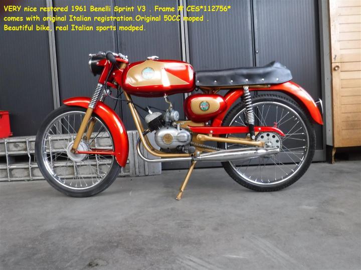 Zeer mooie gerestaureerde Benelli Sprint V3 uit 1961.Frame # CES * 112756 *Wordt geleverd met originele Italiaanse registratie.Originele 50CC-bromfiets. Zeer mooie bromfiets,echte Italiaanse sport brommer. Grootste keus in ECHTE klassiekers met meer dan 450 stuks in "de Stolze Collectie", van project tot perfect !